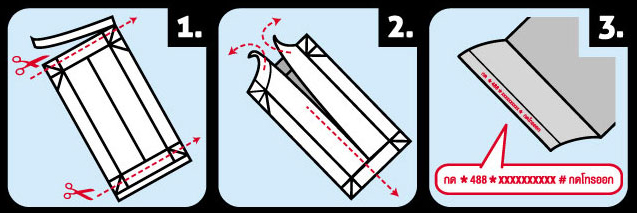 - กดรหัส *488* รหัส 10 หลัก อิชิตัน ใต้ฝา หรือข้างในกล่องตามด้วย # แล้วกดโทรออก เช่น *488*1234567890# และกดโทรออก