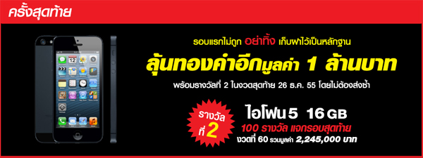 รอบแรกไม่ถูก อย่าทิ้งฝา!!! หรือกล่อง เก็บไว้เป็นหลักฐาน และลุ้นทองคำอีกมูลค่า 1 ล้านบาท พร้อมรางวัลที่ 2 ไอโฟน 5 16 GB จำนวน 100 รางวัล ในงวดสุดท้าย 26 ธ.ค. 55