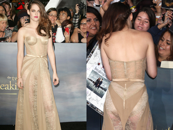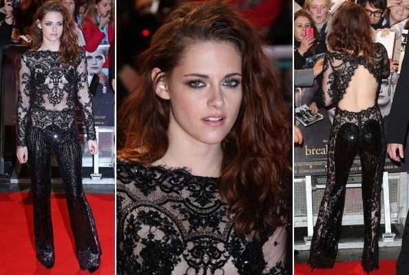 คริสเต็น สจ๊วต ในชุดเดรสเกาะอกซีทรูสีงาช้างที่เผยให้เห็นเรียวขาด้านใน จาก Zuhair Murad คอลเลคชั่น Fall 2012 รองเท้า จาก Jimmy Choo และ เครื่องประดับ จาก Iwona Ludyga